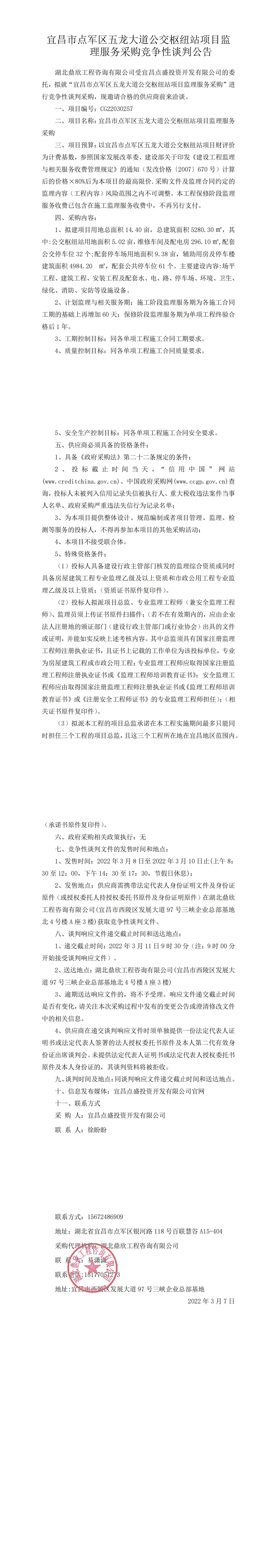 宜昌市點(diǎn)軍區(qū)五龍大道公交樞紐站項(xiàng)目監(jiān)理服務(wù)采購競(jìng)爭(zhēng)性談判公告