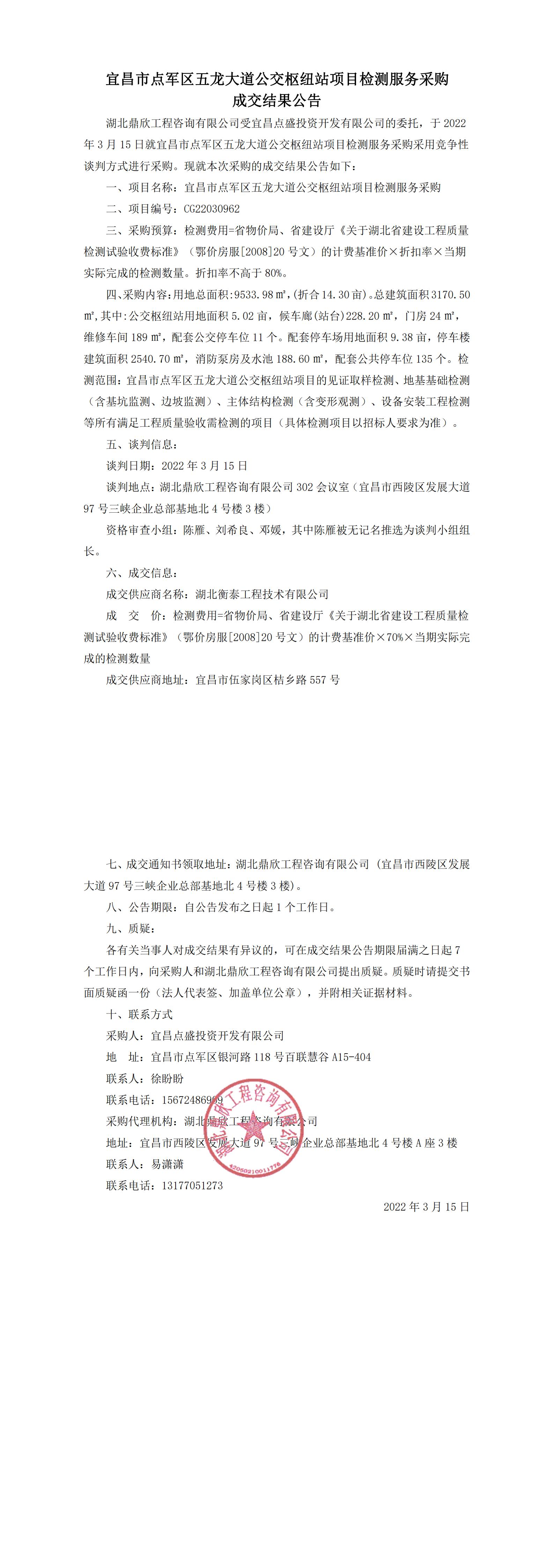 宜昌市點軍區(qū)五龍大道公交樞紐站項目檢測服務(wù)采購結(jié)果公告