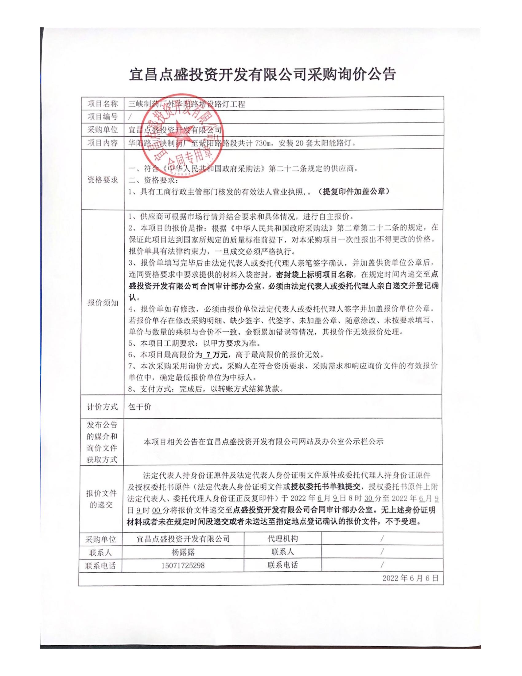 詢(xún)價(jià)公告-三峽制藥廠外華陽(yáng)路增設(shè)路燈工程