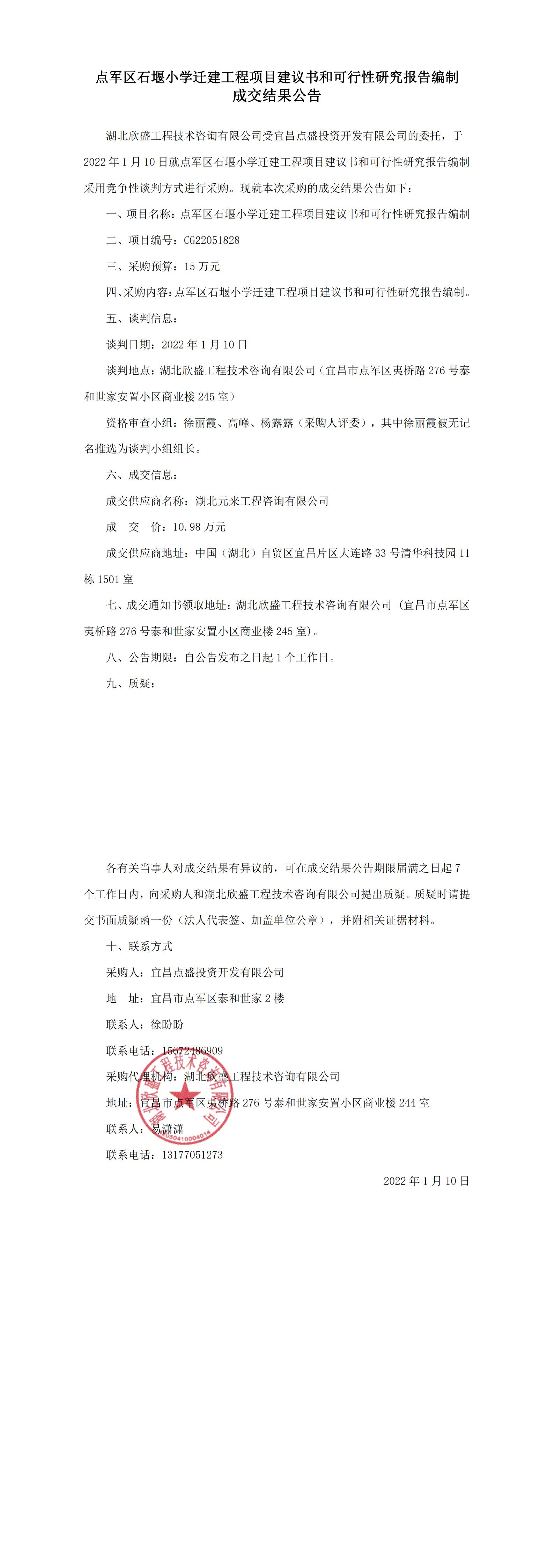 點軍區(qū)石堰小學遷建工程項目建議書和可行性研究報告編制成交結果公告