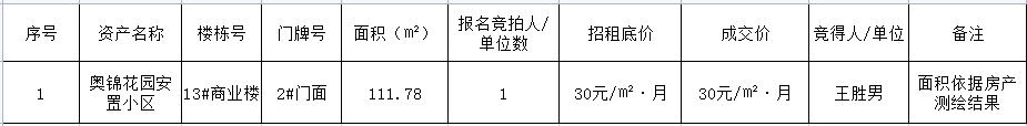 根據(jù)《點(diǎn)軍區(qū)出資企業(yè)資產(chǎn)租賃管理暫行辦法》及《宜昌點(diǎn)盛投資開發(fā)有限公司國有資產(chǎn)經(jīng)營使用實(shí)施辦法修訂版(2022.3)》,現(xiàn)對(duì)奧錦花園小區(qū)商業(yè)2#門面三年租賃權(quán)公開招租結(jié)果公告如下: