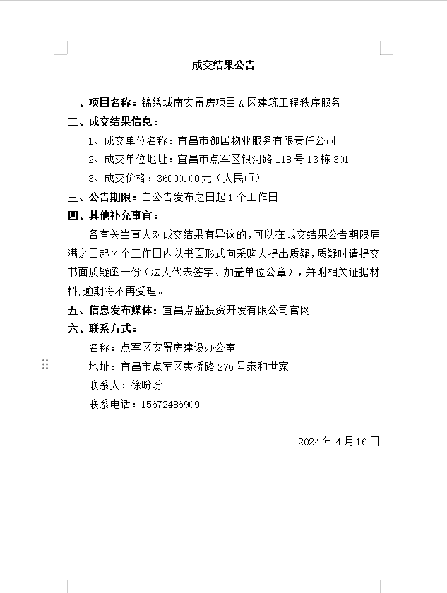 錦繡城南安置房項目A區(qū)建筑工程秩序服務成交公告