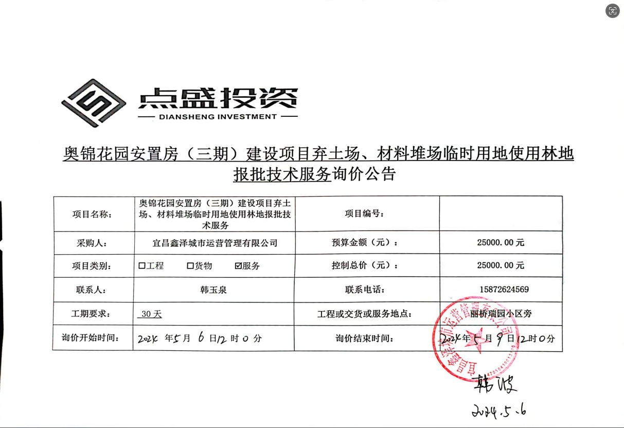 奧錦花園安置房(三期)建設(shè)項(xiàng)目棄土場(chǎng)、材料堆場(chǎng)臨時(shí)用地使用林地報(bào)批技術(shù)服務(wù)詢(xún)價(jià)公告
