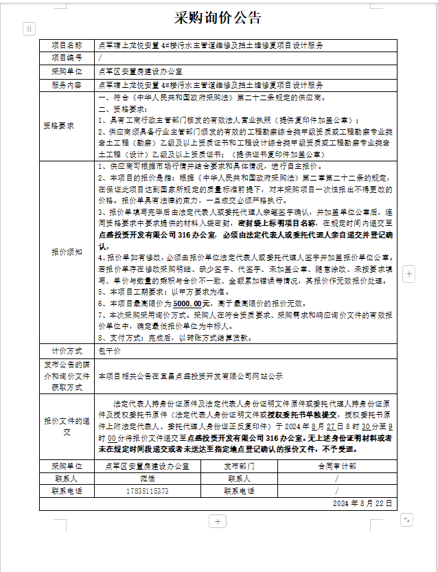 點(diǎn)軍塘上龍悅安置4#樓污水主管道維修及擋土墻修復(fù)項(xiàng)目設(shè)計(jì)服務(wù)詢價(jià)公告