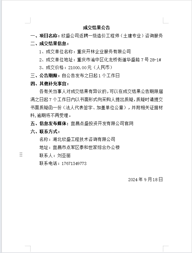 欣盛公司返聘一級造價工程師(土建專業(yè))咨詢服務(wù) 成交公告