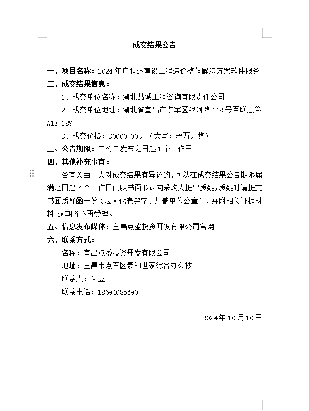 2024年廣聯(lián)達建設(shè)工程造價整體解決方案軟件服務(wù)成交公告