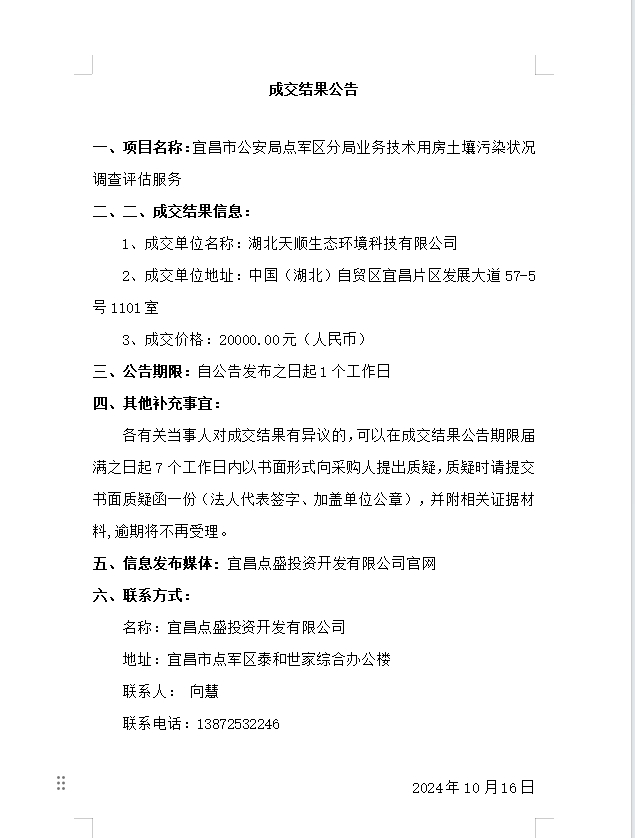 宜昌市公安局點(diǎn)軍區(qū)分局業(yè)務(wù)技術(shù)用房土壤污染狀況調(diào)查評(píng)估服務(wù)成交公告