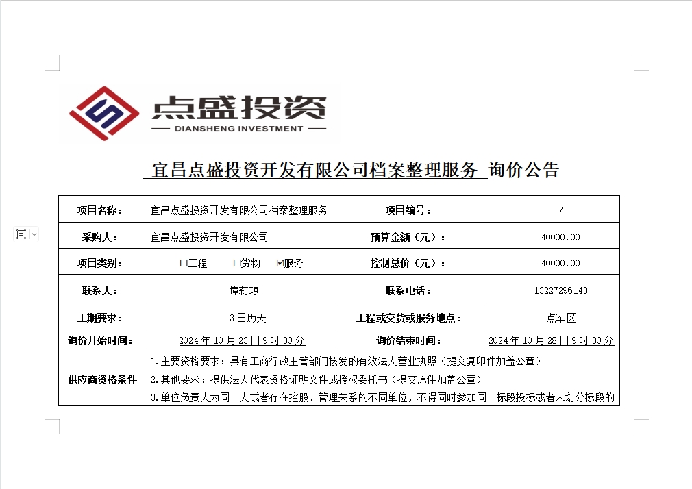 宜昌點(diǎn)盛投資開發(fā)有限公司檔案整理服務(wù)詢價(jià)公告