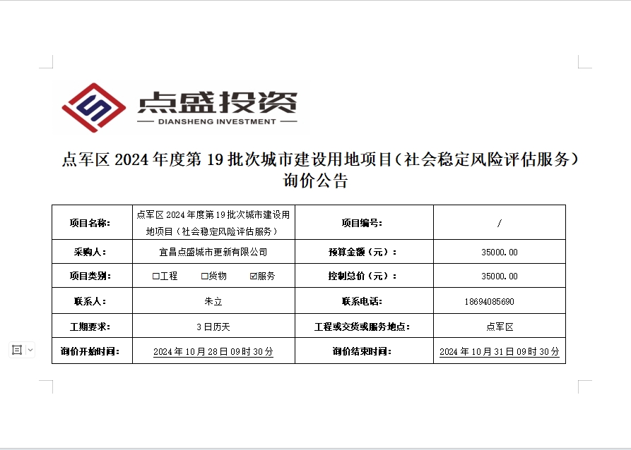 點軍區(qū)2024年度第19批次城市建設(shè)用地項目(社會穩(wěn)定風(fēng)險評估服務(wù))詢價公告