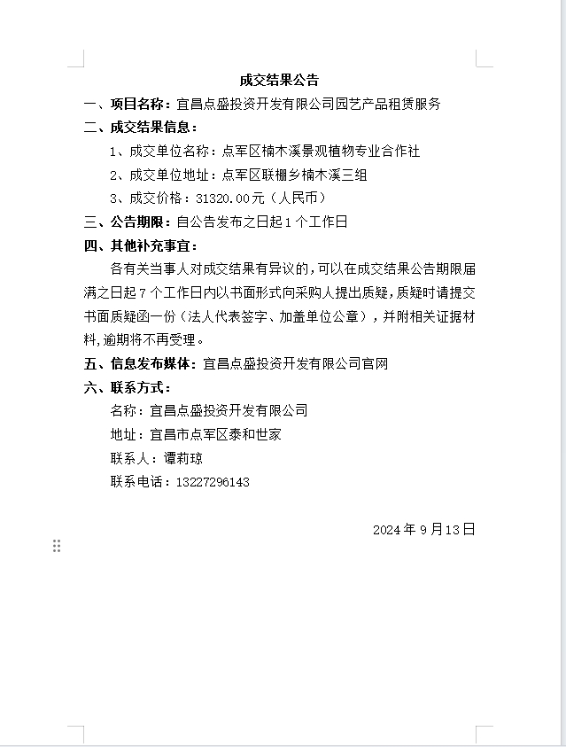 宜昌點盛投資開發(fā)有限公司園藝產(chǎn)品租賃服務成交公告