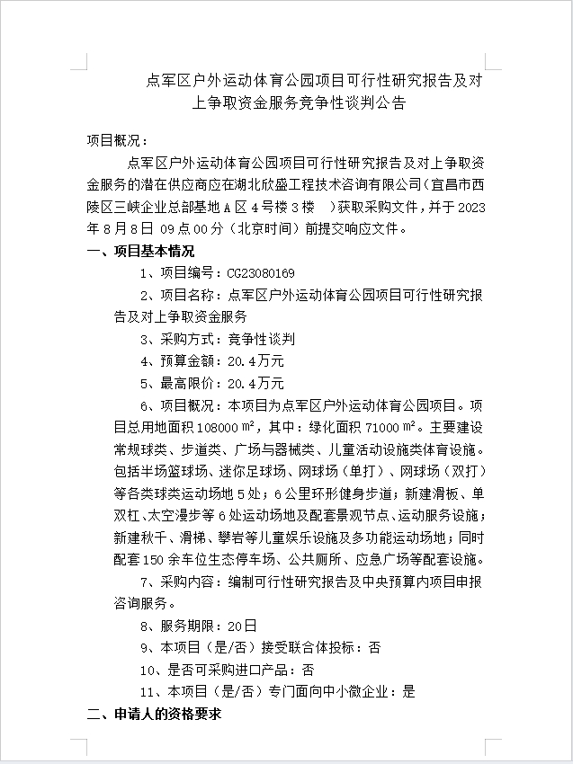 點(diǎn)軍區(qū)戶外運(yùn)動(dòng)體育公園項(xiàng)目可行性研究報(bào)告及對(duì)上爭取資金服務(wù)談判公告
