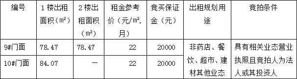 上述第9號門面房整體出租1至2樓,10#門面房只出租一樓。目前,上述門面房均處于空置的毛坯狀態(tài),現(xiàn)狀分別對外出租。相關(guān)競買事項(xiàng)詳見本公司拍賣資料中的《競買協(xié)議》樣本特別說明條款內(nèi)容,且標(biāo)的物自公告之日起至2021年12月10日17:00止,在標(biāo)的物現(xiàn)場展示(集中看房時(shí)間定于2021年12月10日8:30-12:00,14:00-17:00)。